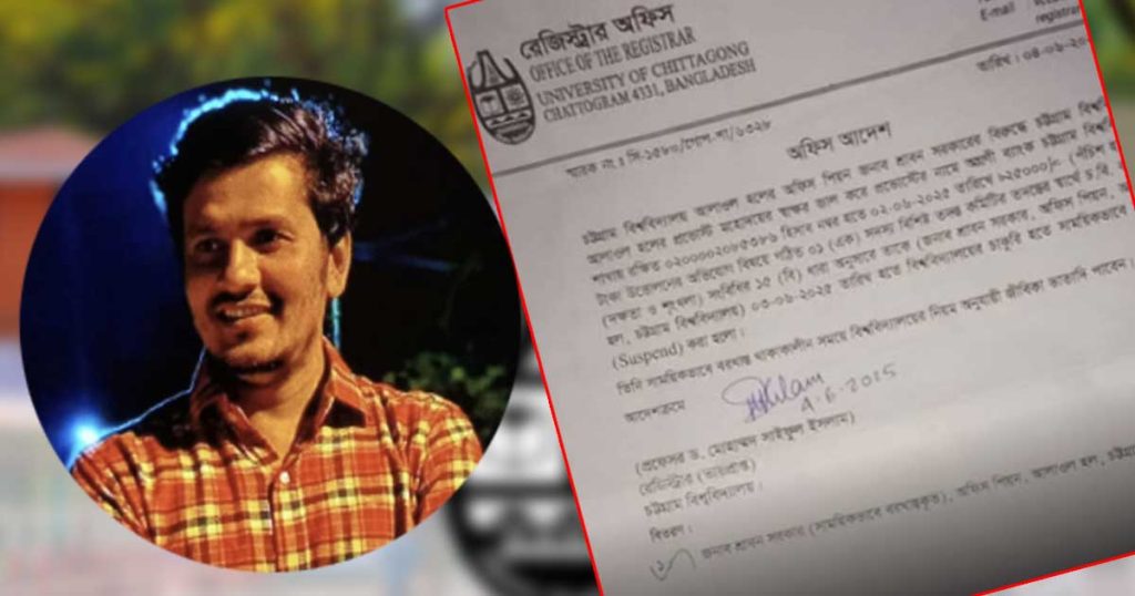 চট্টগ্রাম বিশ্ববিদ্যালয়ে (চবি) স্বাক্ষর জালিয়াতি করে টাকা উত্তোলনের অভিযোগে শ্রাবণ সরকার নামে আলাওল হলের অফিস সহকারীকে সাময়িক বরখাস্ত করেছে বিশ্ববিদ্যালয় প্রশাসন। একই ঘটনায় হলের আরও দুই কর্মচারীকে কারণ দর্শানোর (শোকজ) নোটিশ দেওয়া হয়েছে।