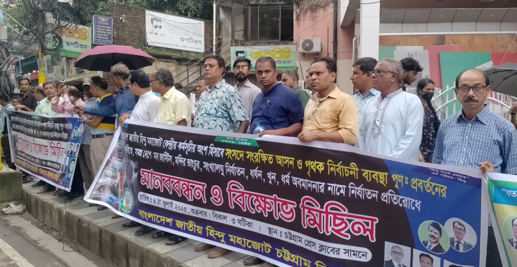 জাতীয় সংসদে সংরক্ষিত আসন সহ পৃথক নির্বাচন ব্যবস্থা পুণঃ প্রর্বতনের দাবিতে সমগ্র দেশে সনাতনী সম্প্রদায়ের উপর অমানুষিক নির্যাতন, মঠ-মন্দির ও প্রতিমা ভাঙ্গচুন, চাঁদাবাজী, জমি দখল, খুন, ধর্ষণ, মিথ্যা মামলা দায়ের প্রতিবাদে বাংলাদেশ জাতীয় হিন্দু মহাজোট চট্টগ্রাম বিভাগীয় কমিটির উদ্যোগে এক বিশাল মানববন্ধন ও বিক্ষোভ মিছিল অনুষ্ঠিত হয়।