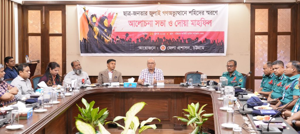 জুলাই গণঅভ্যুত্থানে শহিদদের স্মরণে আলোচনা সভা ও দোয়া মাহফিল অনুষ্ঠিত হয়েছে। ১৬ জুলাই (বুধবার) চট্টগ্রাম সার্কিট হাউসের সম্মেলন কক্ষে এ অনুষ্ঠান কার্য অনুষ্ঠিত হয়। এতে প্রধান অতিথি হিসেবে উপস্থিত ছিলেন মুক্তিযুদ্ধ বিষয়ক মন্ত্রণালয় এবং দুর্যোগ ব্যবস্থাপনা ও ত্রাণ মন্ত্রণালয়ের উপদেষ্টা ফারুক ই আজম।