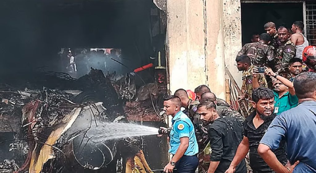 এর আগে দুপুর ১টা ১৮ মিনিটের দিকে উত্তরার দিয়াবাড়ীর মাইলস্টোন স্কুল ও কলেজ ক্যাম্পাসে বিমান বাহিনীর এফ-৭ বিজেআই মডেলের প্রশিক্ষণ বিমানটি বিধ্বস্ত হয়। আছড়ে পড়ার সঙ্গে সঙ্গে বিমানটিতে আগুন ধরে যায়। বিমানে ছিলেন ফ্লাইট লেফটেন্যান্ট তৌকির। কলেজের হিসাববিজ্ঞান বিভাগের সহকারী অধ্যাপক সবুজ মিয়া সাংবাদিকদের বলেন, স্কুলের দোতলা ভবনের প্রবেশ মুখে বিমানটি বিধ্বস্ত হয়েছে। তখন স্কুল ছুটি হয়ে গেছে। কিছু শিক্ষার্থী বের হয়ে গেলেও অনেকে ভেতরেই ছিল। বিমানটি বিধ্বস্ত হওয়ার পরই আগুন ধরে যায়।