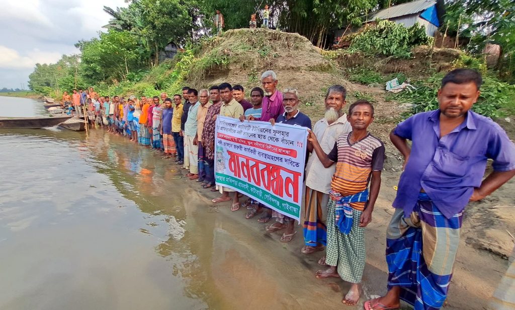 তাই রোববার বিকাল ৫টায় থেকে সন্ধা ৬টা পর্যন্ত নদী ভাঙন রোধে নদী শাসন ব্লক /জিও ব্যাগ স্থাপনের কাজের মাধ্যমে স্থায়ী প্রতিকার চেয়ে নদী পাড়ে মানববন্ধন করেছে শতাধিক ক্ষতিগ্রস্থ পরিবার।ঘন্টাব্যাপী এ মানববন্ধন চলাকালে বক্তব্য রাখেন, অতুল চন্দ্র দাস,ভবানী চন্দ্র দাস,সজল চন্দ্র সরকার,মোমতাজ আলী শেখ,খোরশেদ আলী শেখ,নূর আলম শেখসহ অনেকে।