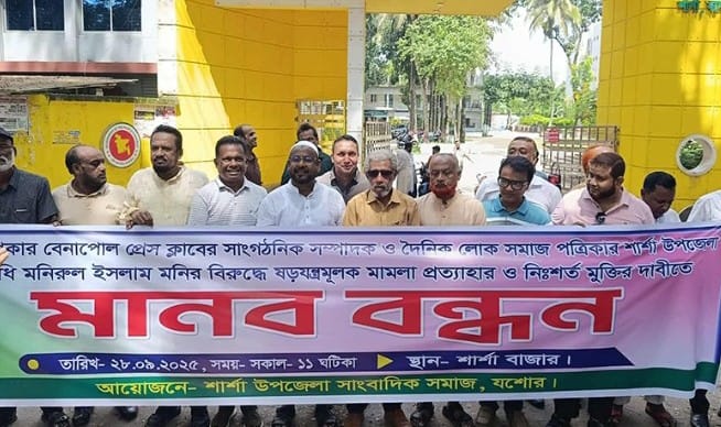 যশোরের শার্শা উপজেলায় ষড়যন্ত্রমূলক মিথ্যা মামলায় আটক হওয়া দৈনিক দিনকাল ও দৈনিক লোকসমাজ পত্রিকার উপজেলা প্রতিনিধি মনিরুল ইসলাম মনি’র নিঃশর্ত মুক্তি এবং মামলা প্রত্যাহারের দাবিতে মানববন্ধন অনুষ্ঠিত হয়েছে।