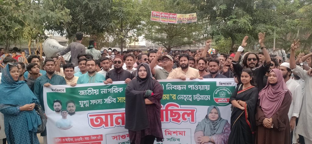 রাজনৈতিক দল হিসেবে জাতীয় নাগরিক পার্টি এনসিপি নিবন্ধন পাওয়ায় চট্টগ্রামে জাতীয় নাগরিক পার্টি (এনসিপি) যুগ্ম সদস্য সচিব ও চট্টগ্রাম ১০ সংসদীয় আসনের এনসিপির সম্ভাব্য পদপ্রার্থী সাগুফতা বুশরা মিশমার নেতৃত্বে আনন্দ মিছিল করে জাতীয় নাগরিক পার্টি চট্টগ্রাম। মিছিলে শাপলা কে দলীয় প্রতিক হিসেবে বরাদ্দের দাবি জানানো হয়।
